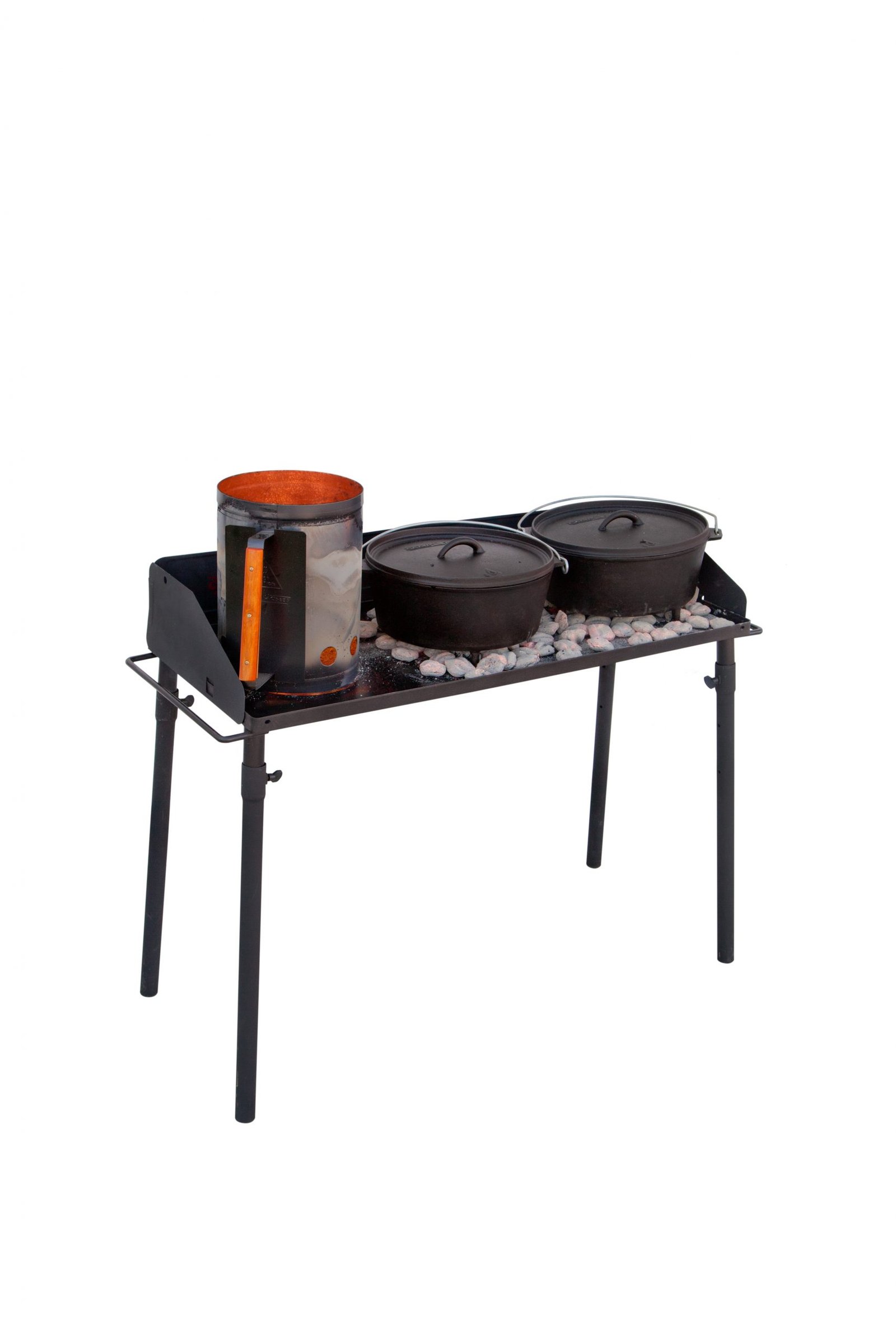 - Holds up two 16″ Dutch ovens side by side or three 12″ Dutch ovens side by side