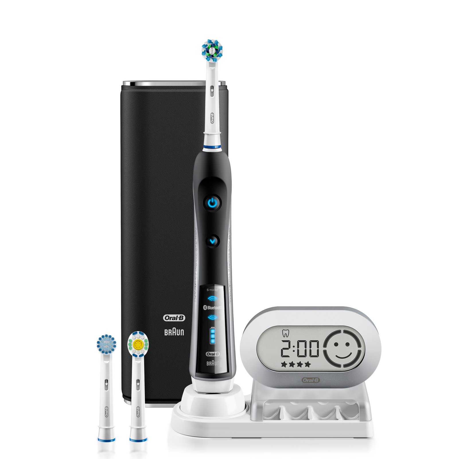 The Oral-B SmartSeries Black 7000 with Bluetooth technology is the world’s first electric toothbrush of its kind with Bluetooth connectivity. Bluetooth communication allows the brush to connect with your smartphone to give you real-time feedback on your brushing habits. The professionally inspired design of the CrossAction brush head surrounds each tooth with bristles angled at 16 degrees, and 3D cleaning action oscillates, rotates, and pulsates to break up and remove up to 500% more plaque than a regular manual toothbrush. Rechargeable handle has 6 modes for every oral care need: Daily Clean, Gum Care, Sensitive, Whitening, Deep Clean, and Tongue Cleaning. The pressure sensor lights up if you brush too hard to prevent harmful over-brushing and there are 6 modes and a timer to help you brush for a dentist-recommended 2 minutes. Package includes 1 Oral-B SmartSeries handle, 1 CrossAction brush head, 1 3D White brush head, 1 Sensitive brush head, 1 premium charger with refill head storage, 1 premium travel case, smart guide. SmartSeries handles are compatible with the following replacement toothbrush heads: CrossAction, 3D White, Sensitive Clean, Precision Clean, FlossAction, Deep Sweep, Ortho and Dual Clean. Trust in the precision engineering of Braun and the dental expertise of Oral-B, the #1 brand used and recommended by dentists worldwide. 100% Satisfaction Guaranteed. Manufacturer Contact Information Customer support : (800) 566-7252 or (800) 566-ORALB