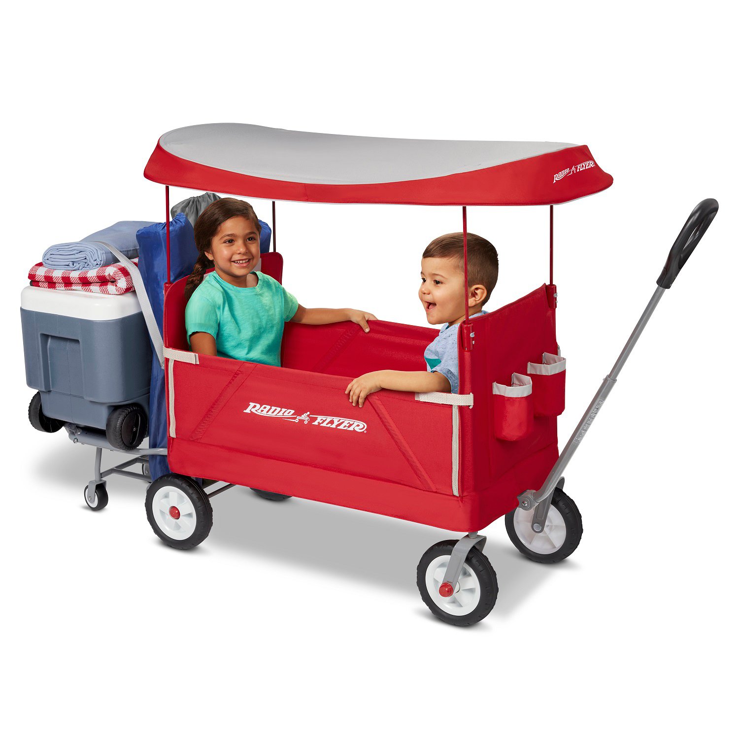Radio Flyer?s 3-in-1 Tailgater Wagon® with Canopy is designed as a full-sized, EZ fold wagon for kids that offers additional cargo storage. The stow away cooler caddy provides extra space for the family?s cooler, folding chairs and other tailgating needs. With an easy one hand fold, you can take or store the wagon anywhere! The high seat backs and thick padded seats with seat belts provide a comfortable ride, while the UV canopy protects from the sun. The canopy can be stored in the rear storage pouch and the canopy poles retract into the wagon frame while not in use. The safety straps and zippers transform the wagon into bench seating. The DuraClean® fabric can be easily wiped clean and features 2 front cup holders, plus the handle stays upright when not in use. Maximum weight capacity 150 lbs. in wagon and 50 lbs. on cooler caddy. For 1 ½+ years.