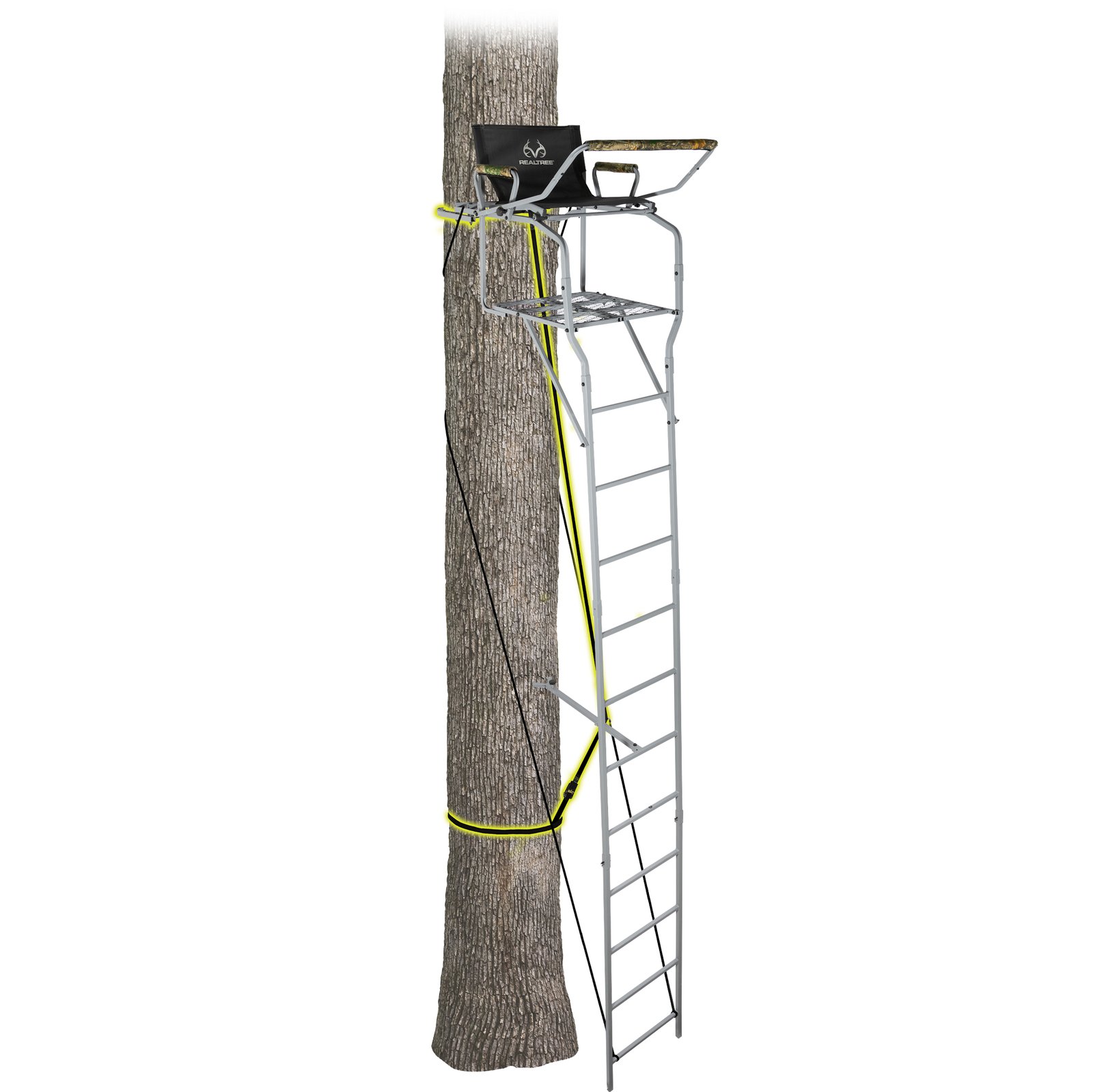 The new Realtree Deluxe Extra-Wide Single Person 15’ Ladder stand features the patented Primal Grip Jaw System, making this ladder stand rock solid before you ever leave the ground. The 24” extra wide, flip up textilene seat and camo padded flip-up shooting rail allows for all day hunting comfort. This ladder stand also features a 20″ wide ladder, giving the hunter the ability to easily ascend, descend, and change direct. The Realtree Deluxe Extra-Wide Single Person 15′ Ladder Stand is rated for up to 300 lbs. and has a weight of 68.3 lbs. A full body safety harness is included with this ladder stand.Realtree Xtra Wide Single Person Hunting Ladder Stand