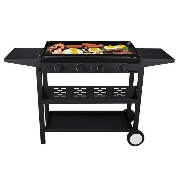 4 control knobs allow you to adjust the temperature of different heating zones (preservation, low, medium, high). 2 side table and bottom shelf offer sufficient storage space for you. It’s ideal for cooking eggs, pancakes, bacon, steak, potatoes and other grilled food. You can use it in patio, garden, backyard, etc.