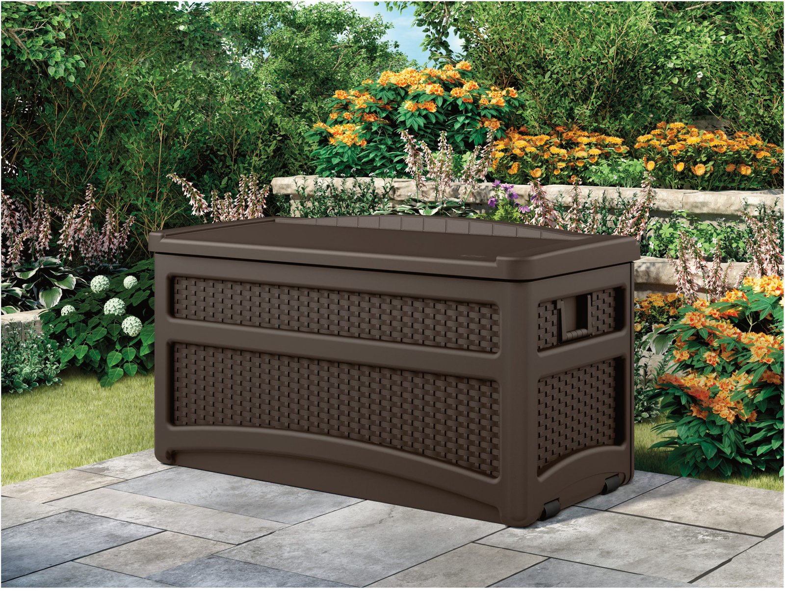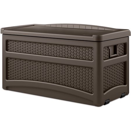 Decorate your outdoor patio with the functional Suncast 73-Gallon Resin Wicker Storage Deck Box! This versatile deck box doubles as an outdoor storage unit and an additional seat for your patio, porch, or deck set. It’s constructed of durable resin that is fade, dent, chip, and peel-resistant to provide years of quality use. It’s weather-resistant construction will withstand seasonal elements, such as heavy rainfall, strong winds, or frigid temperatures. The contemporary wicker design and attractive java brown finish is great with any patio or backyard decor. It features an integrated wheels and a pull-handle to allow for easy mobility. Use this deck box to store seat cushions and pillows, gardening tools, pool accessories, sports equipment, and more! The lid is pad-lockable to keep your contents safe around the clock (padlock not included). Place a cushion on top of the box for additional comfort when being used as a patio bench for your guests. Measuring 23.75 in. x 46 in. x 25.5 in., Suncast’s 73-Gallon Resin Wicker Storage Deck Box is the perfect addition to your outdoor furniture.