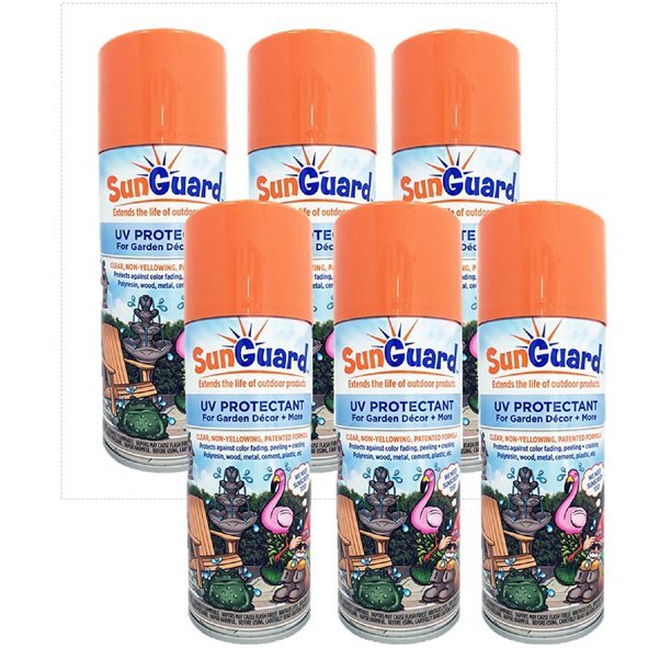 Sunguard UV Protectant spray helps extend the life of outdoor decor. The strong UV inhibitors protects all types of outdoor decor against fading, peeling and cracking. When dried it has as clear finish, unlike polyurethane products, which will leave a sticky yellowish residue. Unfortunately most garden decor products come directly from manufactures without UV protectant or possibly a light coat which rarely last more than one season. Thus leaving your special investment “exposed” to the harmful elements which cause fading, cracking and peeling. Everyone is now discovering that outdoor decor needs sunscreen too. SunGuard has been designed to work on resin, polyresin, wood, metal, fiberglass, cement, plastics, stone, ceramic, tile, polyester, wicker, etc. It is not to late to protect your patio furniture, collectible figurines, pots, planters, garden statues, wreaths, fountains, birdbaths, bird feeder, yard art, garden gnomes, fairies, holiday inflatables, curtains, wind chimes, stepping stones, spinners, flags, grill covers, auto and boat covers, awnings, tarps, tents, and more. (not recommended for glass) Net Wt. 11.75 oz.