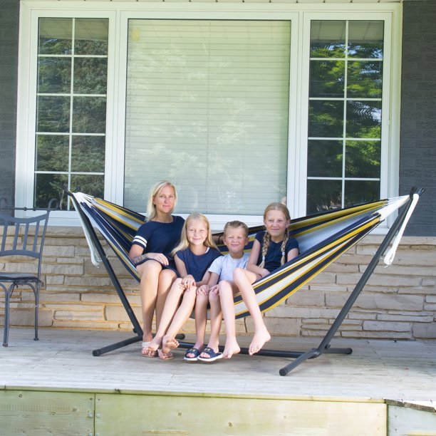 The Universal Hammock Stand with Double Hammock is our favorite and best-selling combo. The double hammock is made with a 100% tightly woven cotton cloth, which allows for a soft and airy, breathable fabric. Polyester end strings are used to ensure a long-lasting hammock. The hammock stand is constructed of heavy duty steel and assembles in minutes without any tools. The zinc-coated legs of the stand prevent rust and plastic caps are used on the ends of the steel tubing to create a soft finish. This means you can move your stand across your patio or deck without scratching the deck or stand. You will enjoy the freedom the stand provides by allowing you to set up your hammock wherever you desire, and the premium carry bag included means you can now take your hammock and stand on the go.