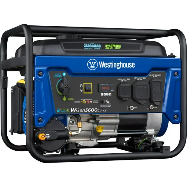The Westinghouse WGen3600DFcv Dual Fuel Portable Generator is a convenient solution to your power needs, on the road or at home. Easily swap between gasoline and propane without shutting off the generator for added convenience and versatility. The powerful 212cc 4-Stroke OHV Westinghouse engine produces up to 4,650 peak watts and 3,600 running watts on gasoline and 4,180 peak watts and 3,240 running watts on propane. The 4 Gal. gas tank with built-in fuel gauge allows the generator to run for up to 14 hours and 16.5 hours on a 20 lb. propane tank. The RV Ready TT-30R and L5-30R outlets easily hook to your travel trailer, with enough power to run a 15,000BTU air conditioner and other necessities all day long via the standard household outlets. The control panel features rubber outlet covers that provide added protection from dust and debris and a built-in Digital Readout that displays real-time information on voltage output, frequency, and lifetime hours. Designed with safety and assurance in mind, the WGen3600DFcv features automatic low oil and carbon monoxide (CO) shutdown, voltage regulation, and overload protection, complete with a 3-Year Limited Warranty and Lifetime Technical Support, backed by our nationwide Westinghouse service network.