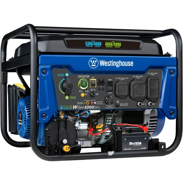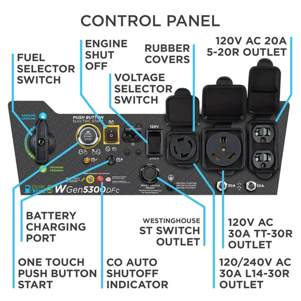 The Westinghouse WGen5300DFc is a versatile solution for all your power needs from your home to your RV when you’re looking for a dependable backup power supply. With dual fuel ability, this generator offers versatility by running on either gas or propane (LPG). The WGen5300DFc produces 6,600 peak watts and 5,300 running watts with a powerful 274cc 4-Stroke OHV Westinghouse Engine constructed for durability. Running for up to 14.5 hours on a 4.7 gal. (18L) tank of gas, it’s conveniently equipped with a built-in fuel gauge, and Push-Button Electric Start with a remote start key fob. The L14-30R outlet is Transfer Switch Ready to supply total household power which eliminates the hassle for annoying extension cords or power strips. Combined with an RV Ready TT-30R outlet, you can ensure your recreation vehicle or home is ready to go for air conditioners, refrigerators, sump pumps, and home necessities. The intuitive control panel features an adjustable 120/240 Volt Selector Switch to draw more power with added flexibility for higher voltage appliances like well pumps. The WGen5300DFc features automatic low oil and carbon monoxide (CO) shutdown, voltage regulation, and overload protection, complete with a 3-Year Limited Warranty and Lifetime Technical Support, backed by our nationwide Westinghouse service network.
