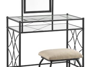 Mainstays Lattice Metal and Glass Vanity Set with Shelf and Upholstered Stool, Black